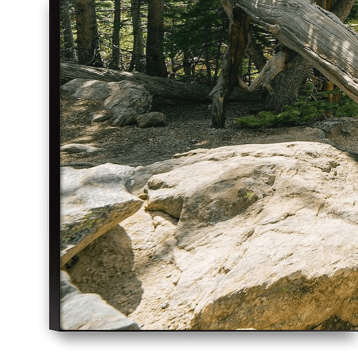 Eine Regenwolke hängt über den Bergen in der Ferne, als ich hier den Blick auf den Nymphensee genieße. Der umgestürzte Baum könnte perfekt als Bank dienen, ist aber mit seinen freiliegenden zackigen Wurzeln so fotogen. Was für eine natürliche Schönheit im Rocky Mountains National Park.