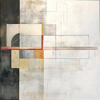 Beige Abstrakt | Cremefarben mit roter Linie – Dies ist ein abstraktes Gemälde mit geometrischen Flächen und feinen Linien, einem weitläufigen cremefarbenen und beigen Hintergrund, einer dunklen Säule auf der linken Seite und einer auffälligen horizontalen roten und gelben Linie in der Mitte; dieses abstrakte Gemälde zeigt zudem eine…