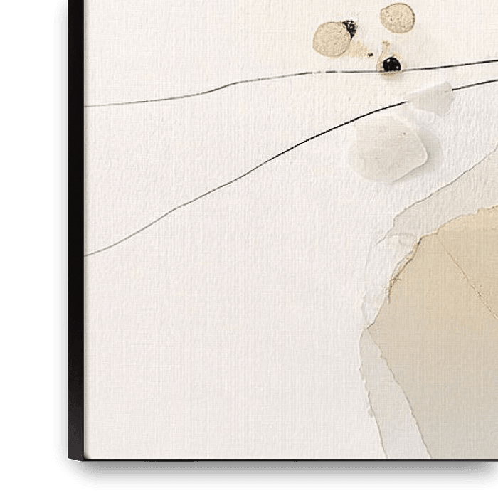 Dieses Kunstwerk zeigt eine abstrakte Komposition, in der organische Formen, transparente Farbflächen und feine schwarze Linien zu einer harmonischen Einheit verschmelzen. In der Mitte sieht man eine Ansammlung fließender Formen in Beige-, Braun-, Grau- und Schwarztönen, ergänzt durch subtile Flecken und körnige Strukturen, die Tiefe…