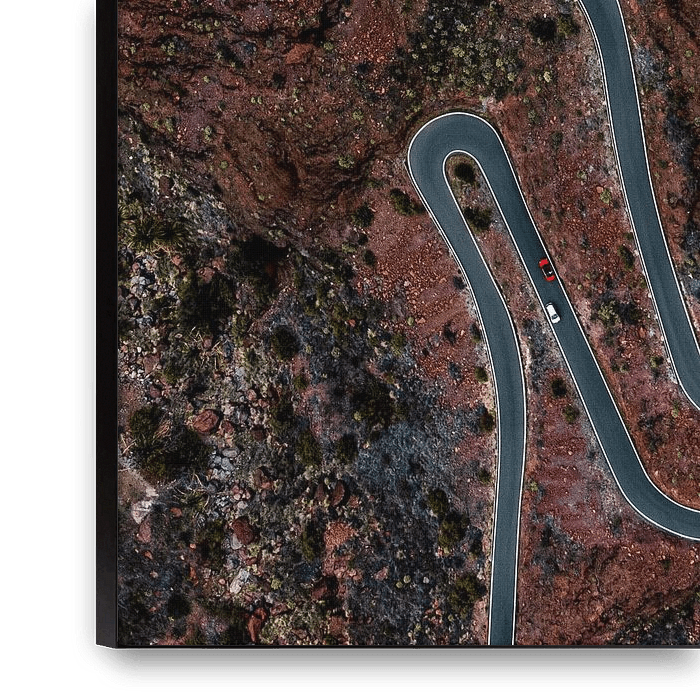 Eine Straße, die über viele Haarnadelkurven den Gipfel der Berglandschaft erreicht. Besonders schön ist es, einen Teil der Strecke mit der Drohne von oben zu fotografieren. Bei den beiden vorbeifahrenden Autos könnte man die Frage stellen, wer fährt bergauf und wer…