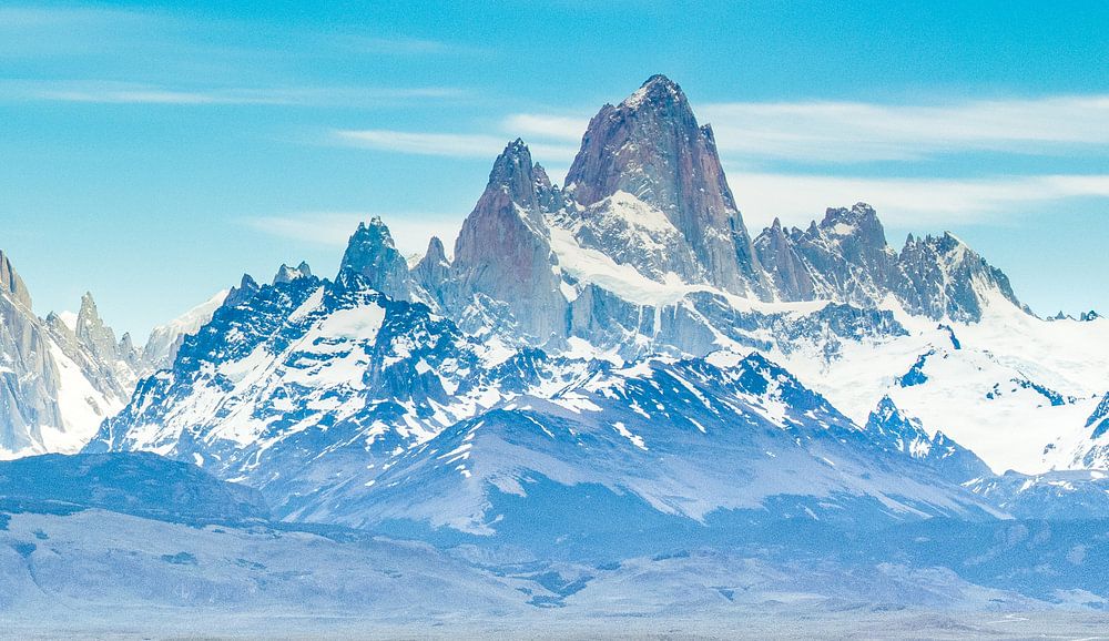 Panoramablick auf zwei der schönsten Berge Patagoniens: Cerro Torre und Monte Fitz Roy, etwas außerhalb der Stadt El Chalten nahe der argentinisch-chilenischen Grenze. Die Landschaft ist geprägt von Gletschern, Bergen und schönen Seen.