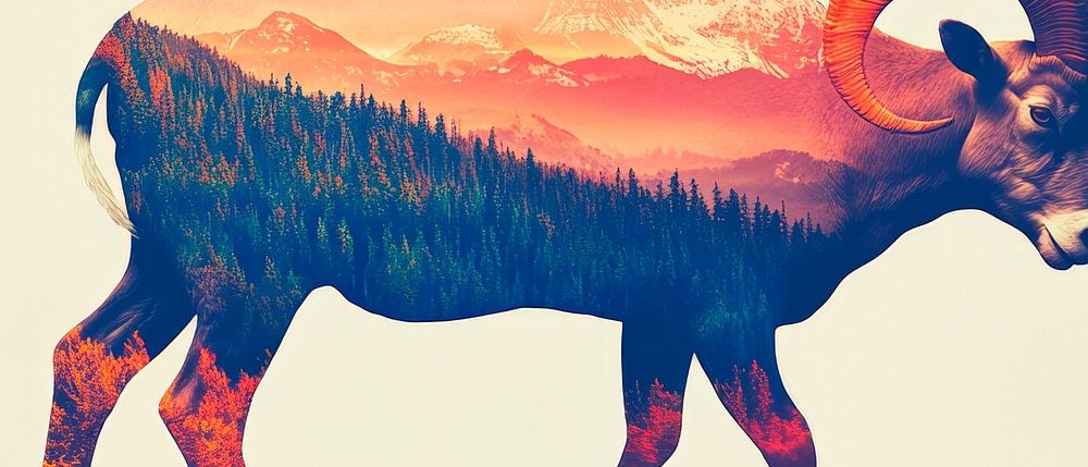 In lebendigen Farben schimmert eine majestätische Bergschaf-Silhouette, in der eine atemberaubende Landschaft aus sanften Hügeln und Bergen eingefangen ist. Diese Kombination aus Natur und Tierwelt bringt eine harmonische Gelassenheit in den Raum. Perfekt für ein Wohnzimmer, wo sie Gespräche anregen und die Natur ins Zuhause holen kann.