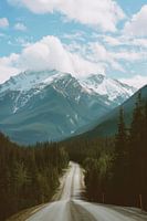 Das Bild zeigt eine beeindruckende Berglandschaft mit schneebedeckten Gipfeln, die majestätisch in einem strahlend blauen Himmel thronen. Ein gewundener Schotterweg schlängelt sich durch dichte, grüne Wälder, die der Szene eine unberührte, natürliche Schönheit verleihen. Die Wolken, die sanft über die Berge ziehen, verleihen der…