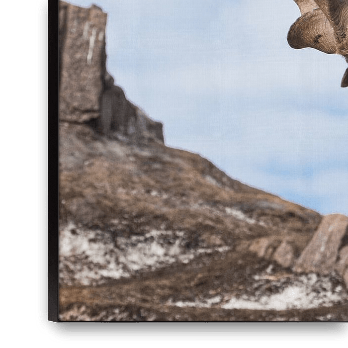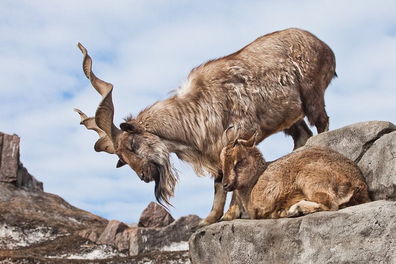 Bestelle das Foto Bergziege mit großen Hörnern (Markhur) steht auf einem Felsen, zu ihren Füßen ein junges Ziegenweibc von Michael Semenov als Reproduktion auf Leinwand, Alu-Dibond, als Poster, Fototapete oder Acrylglasbild.