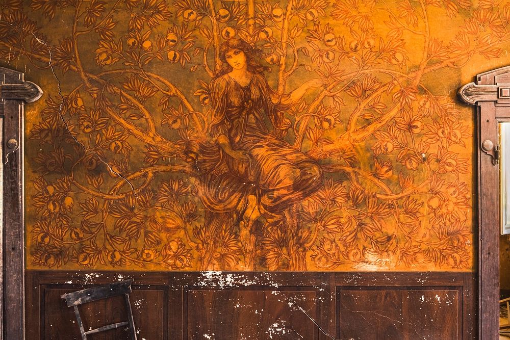 Ich habe dieses wunderschöne Fresko eines bekannten toskanischen Künstlers in einer verlassenen italienischen Villa aus dem 19. Jahrhundert fotografiert. Die Villa ist wunderschön gelegen, aber ihre einzigen Bewohner sind Tauben. Ein Großteil der Villa ist in einem sehr schlechten Zustand, auch das Fresko. Von den Wänden fällt sogar der Putz ab, was ich mit Photoshop repariert habe, und ich befürchte, dass dieses Kunstwerk irgendwann verschwinden wird.