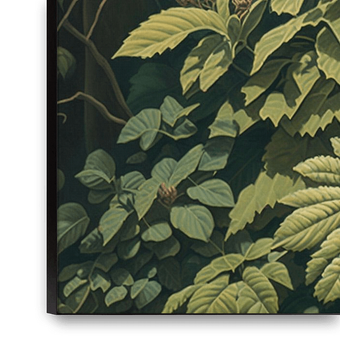 Dieses hochauflösende Kunstwerk zeigt einen üppigen, dichten Wald und fängt die ruhige Schönheit der Natur mit detailreichem Blattwerk ein. Auf der einen Seite dominieren tiefgrüne Blätter, während auf der anderen Seite erdige, bräunlich-grüne Töne einen natürlichen Kontrast bilden. Kleine Zweige, strukturierte Blätter und verschiedene…