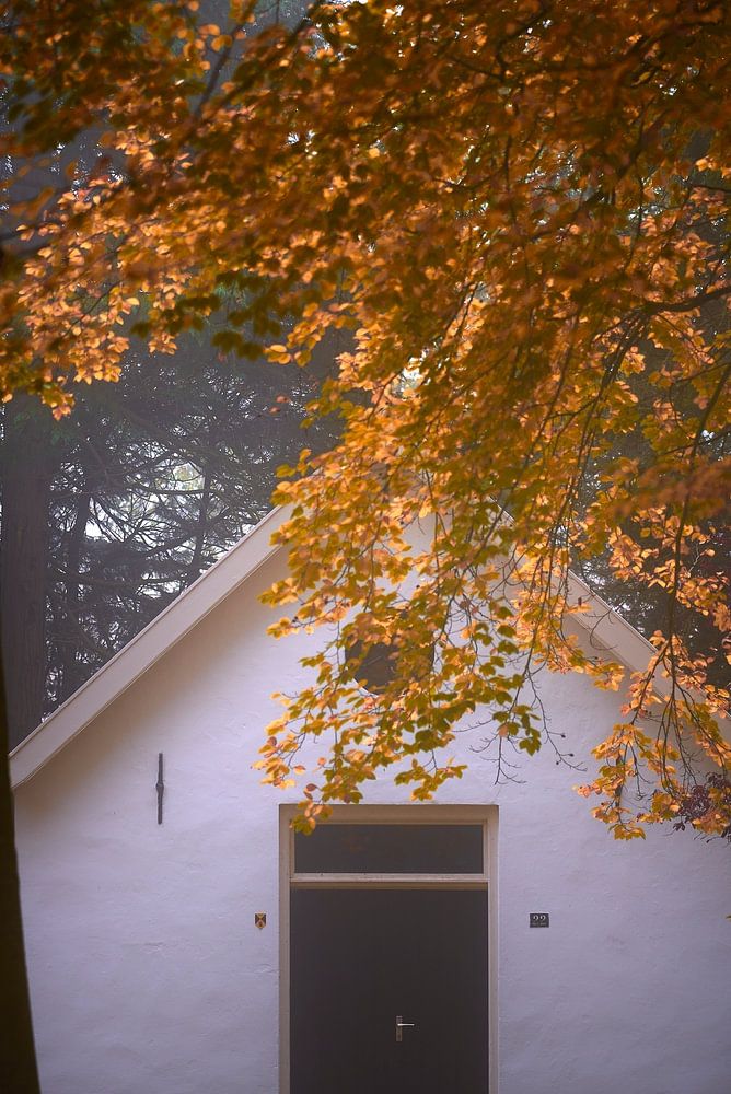 Das kleine, weiße Baarhuisje (Leichenhaus) auf dem ältesten Friedhof im Veluwe-Dorf Nunspeet. Fotografiert im Herbst an einem nebligen Morgen, der die Herbstfarben der imposanten Buchen, die den Weg säumen, zum Vorschein bringt.