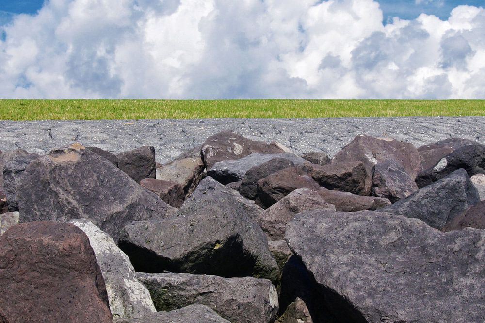 Zwischen den Linien sind schwere Felsbrocken, fünfeckige Betonsäulen, der nicht sichtbare Asphalt Radweg und schließlich eine typisch Terschellinger Luft. Waddenzeedijk Terschelling, Holland.
