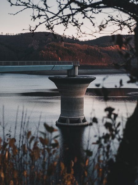 Sonnenuntergang am Biggesee im Sauerland. Industrieromantik an der Talsperre mit orangenen Blättern an den Bäumen.