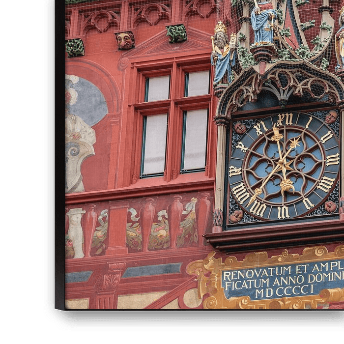 Bild und Uhr auf dem Basler Rathaus in der Schweiz