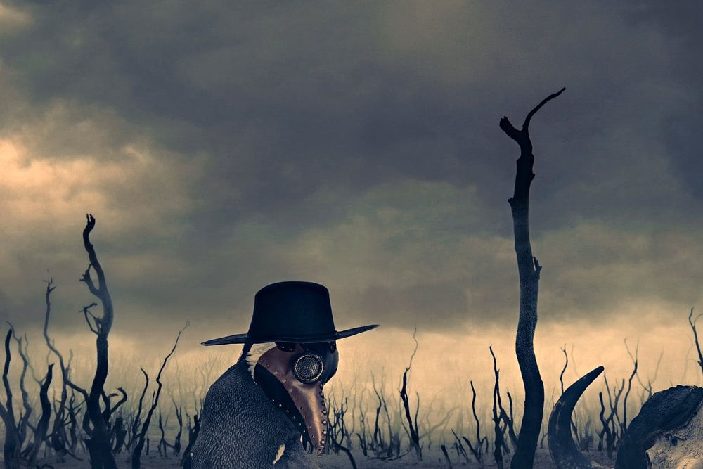 Das ungewöhnliche Bild eines Pinguins, normalerweise ein Symbol für Kälte und Eis, in einer trockenen, trostlosen Umgebung wirft starke Fragen über die Auswirkungen menschlicher Aktivitäten auf unseren Planeten auf. Die Hinzufügung des Pestarztes, einer Figur, die oft mit Krankheit und Unheil assoziiert wird, verstärkt das Gefühl der Bedrohung und der Dringlichkeit im Zusammenhang mit der Klimafrage. Das Kunstwerk lädt den Betrachter ein, über die ökologischen Herausforderungen nachzudenken, mit denen wir konfrontiert sind, und ermutigt zu Maßnahmen zum Schutz unseres Planeten.