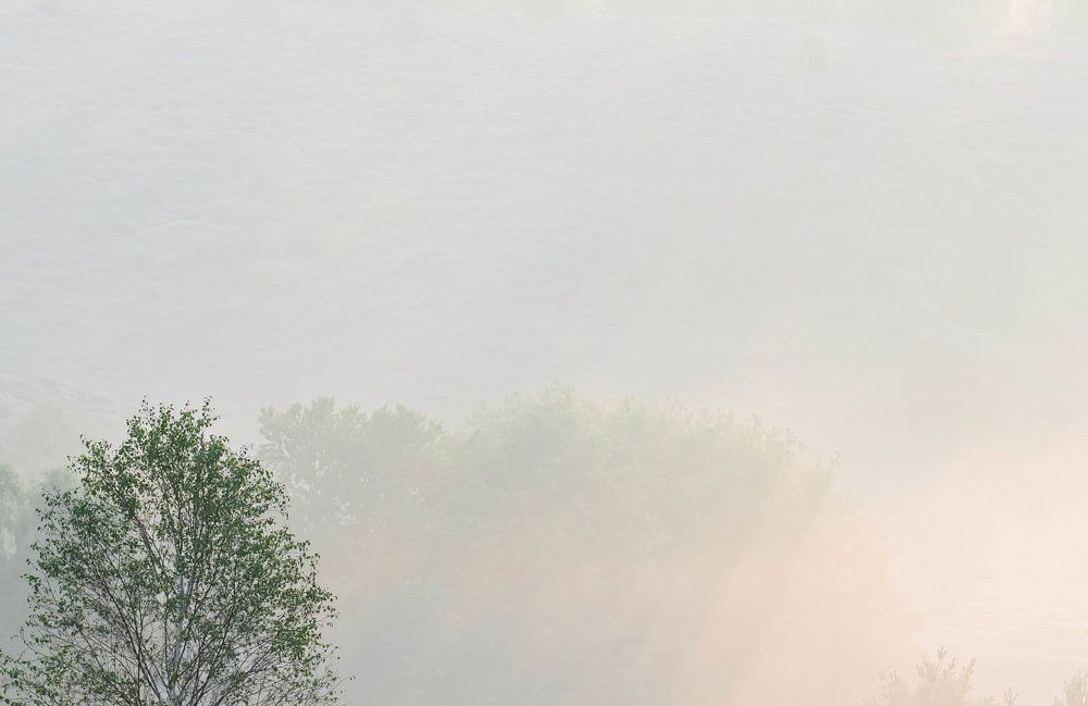 Birken in den Mooren der Veluwe bei Sonnenaufgang mit einer Nebelschicht.
