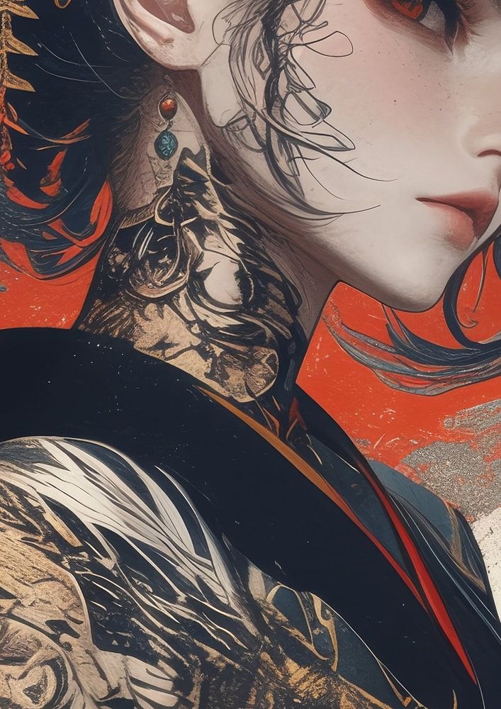 Ein atemberaubendes Mädchen mit Tätowierungen von Klingen und Blumen, die Wildheit und Weiblichkeit vereinen.