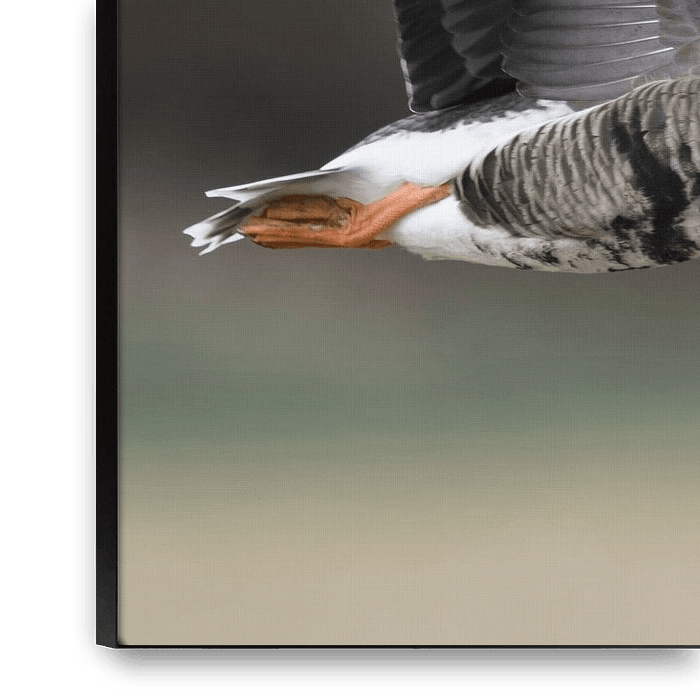 Blaessgans / White-fronted Goose ( Anser albifrons ), in fast flight, close by, in typical rural surrounding of their winter territory, side view, wildlife, Europe.