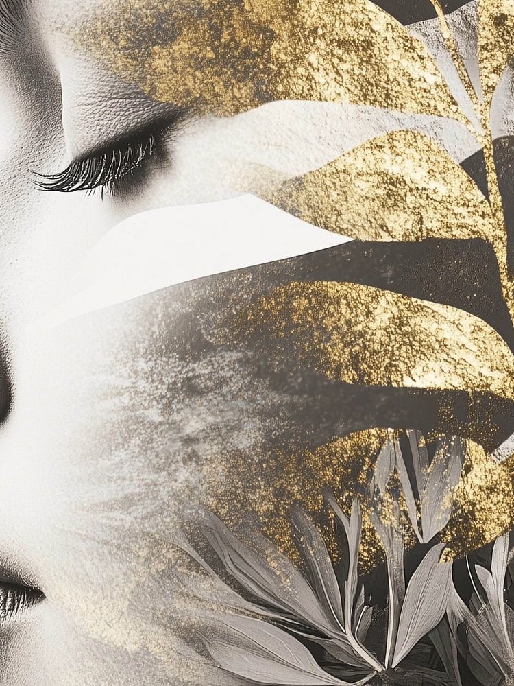 Subtiles Gleichgewicht zwischen Porträt und Natur, in dem sich die Konturen eines Frauengesichts mit Blattstrukturen verflechten. Das in weichen Schwarz-Weiß-Tönen gehaltene Gesicht strahlt Gelassenheit und Ruhe aus. Die Augen sind geschlossen, die Gesichtszüge fein und ruhig, als befände sich die Figur in einem inneren Frieden. Das Porträt wird von goldenen und grauen Blättern durchzogen, die nicht nur dekorativ sind, sondern eine Symbiose zwischen Mensch und Natur suggerieren.