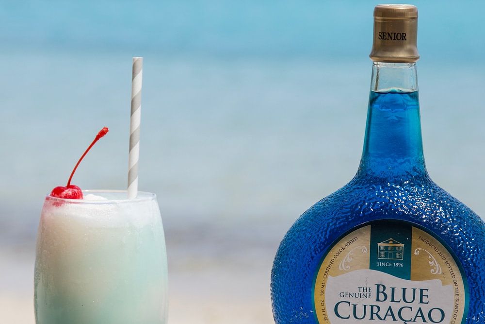 Dieses Foto fängt die Essenz von Curaçao mit einem erfrischenden Blue Curaçao-Getränk an einem sonnigen Strand ein, mit dem kristallklaren Wasser der Insel im Hintergrund. Eine perfekte Darstellung der entspannten tropischen Atmosphäre und der leuchtenden Farben der Insel.