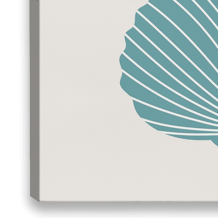 Abstrakte minimalistische Illustration von blauen Muscheln mit weißen Linien auf einem sandfarbenen Hintergrund.
