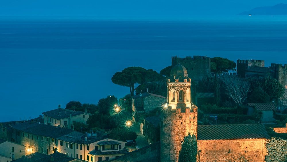 Blaue Stunde über Castiglione della Pescaia, beleuchtete Altstadt, Meer und die Insel Giglio im Hintergrund. Maremma, Region Toskana, Italien, Europa