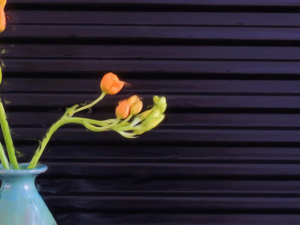 Stilleben blaue Vase und orange Blumen mit schwarzem Hintergrund digitales Ölgemälde