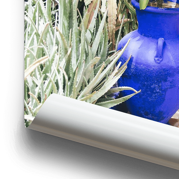 Ein blauer Blumentopf in einem botanischen Garten, der Jardin Majorelle, in Marrakesch.