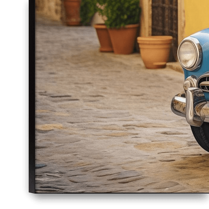 Bestelle das digitale Kunst Bild Blauer alter Oldtimer in einer italienischen Straße, Kunstdesign von Animaflora PicsStock als Reproduktion auf Leinwand, Alu-Dibond, als Poster, Fototapete oder Acrylglasbild.