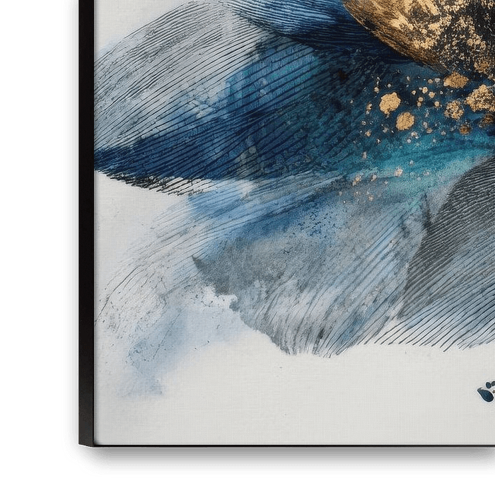 Dieses abstrakte Gemälde in tiefem Blau, Türkis, Grau und goldenen Akzenten mit Federformen wirkt mystisch und elegant. Es bringt Ruhe, Raffinesse und einen Hauch von Luxus in Ihre Einrichtung und verleiht dem Raum ein harmonisches Gefühl. Passt wunderbar zu Japandi, skandinavischen, modernen und industriellen Wohnstilen und ist eine besondere Ergänzung für Wohnzimmer, Schlafzimmer, Büro oder Diele.