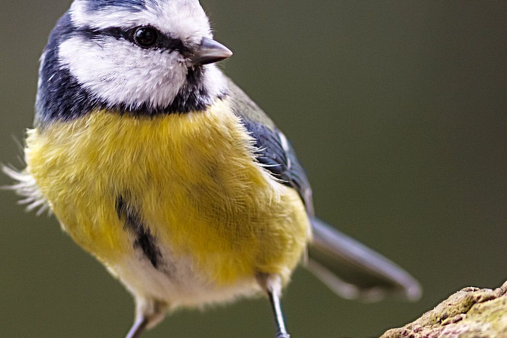 Eine Blaumeise auf einem Baumstamm sucht nach Futter.