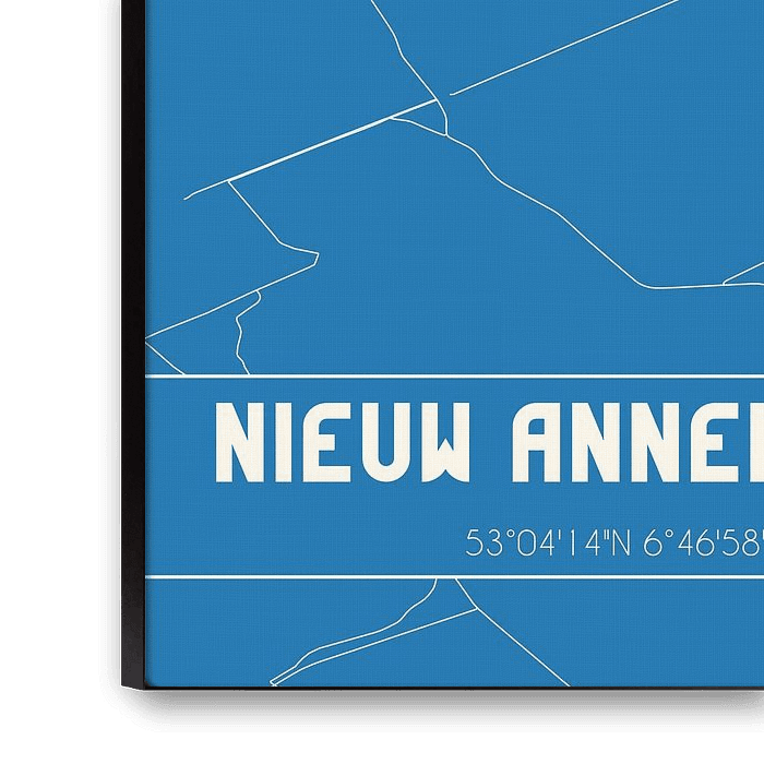 Blaupause der Karte / Karte der niederländischen Stadt Nieuw Annerveen, gelegen in der Gemeinde Aa en Hunze, Provinz Drenthe. Die Karte enthält alle öffentlichen Straßen und die Koordinaten des Zentrums von Nieuw Annerveen.