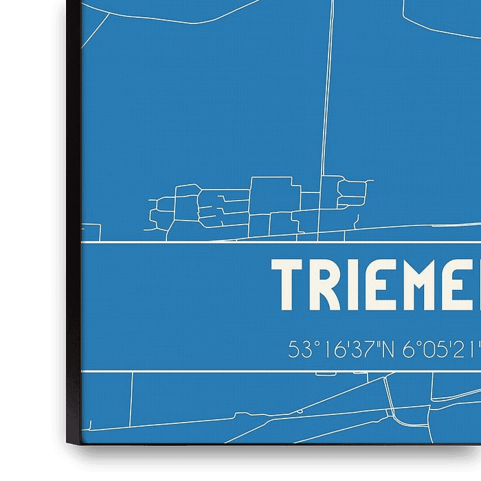 Blaupause der Karte / Karte der niederländischen Stadt Triemen, gelegen in der Gemeinde Noardeast-Fryslan, Provinz Fryslan. Die Karte enthält alle öffentlichen Straßen und die Koordinaten des Zentrums von Triemen.