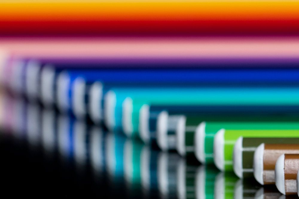 Alle Buntstifte in Regenbogenfarben in einer Reihe. Die Fotos sind einzigartig, weil der Brennpunkt auf jedem Foto ein wenig weiter weg ist. Auf dem ersten Foto liegt der Brennpunkt vorne, auf dem letzten Foto hinten.