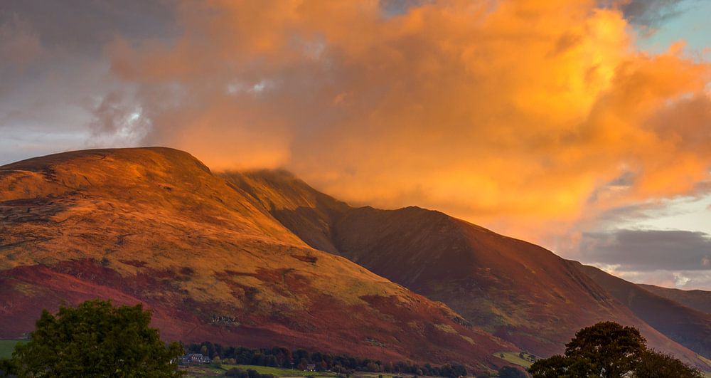 Blencathra ist einer der vielen Berge des englischen Lake District in der Grafschaft Cumbria. Hier sehen wir den Berg am frühen Morgen bei einem farbenprächtigen Sonnenaufgang.