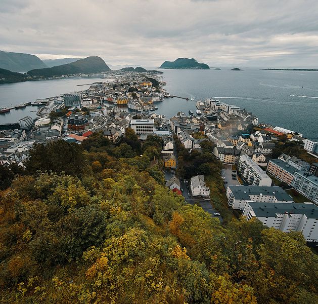 Über „Blick auf Ålesund zu Beginn des Herbstes vom Aussichtspunkt des Berges Aksla, Norwegen“ von qtx