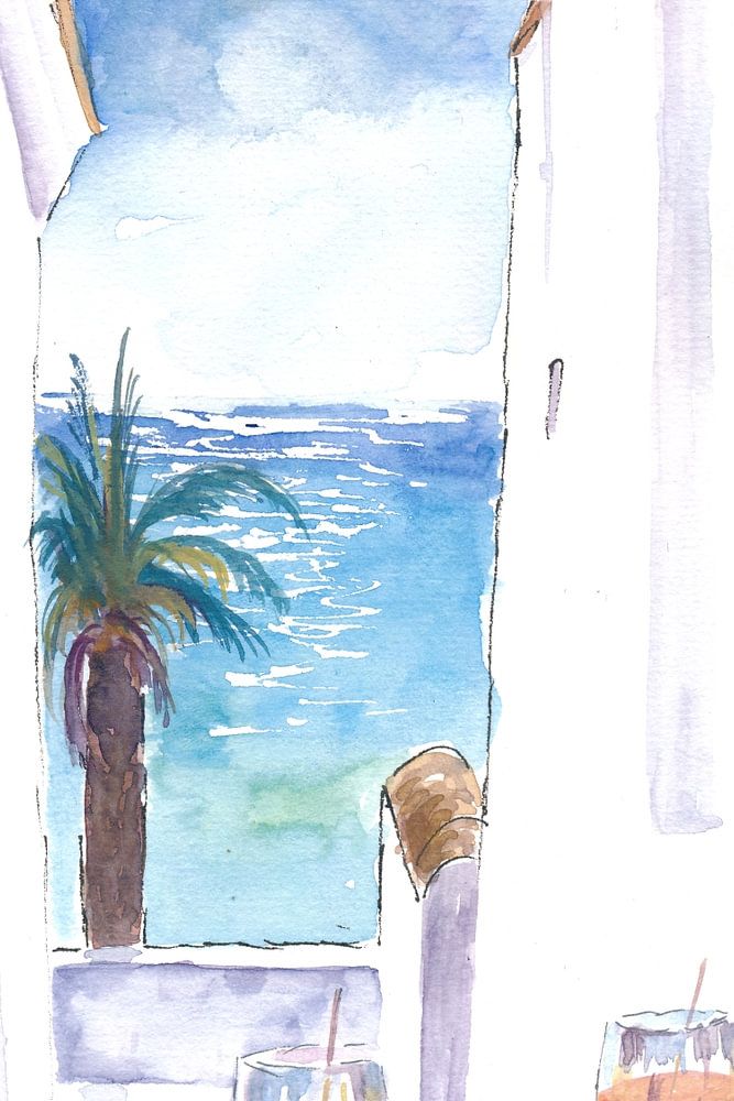 Blick auf das Mittelmeer in einer kleinen Gassenbar
