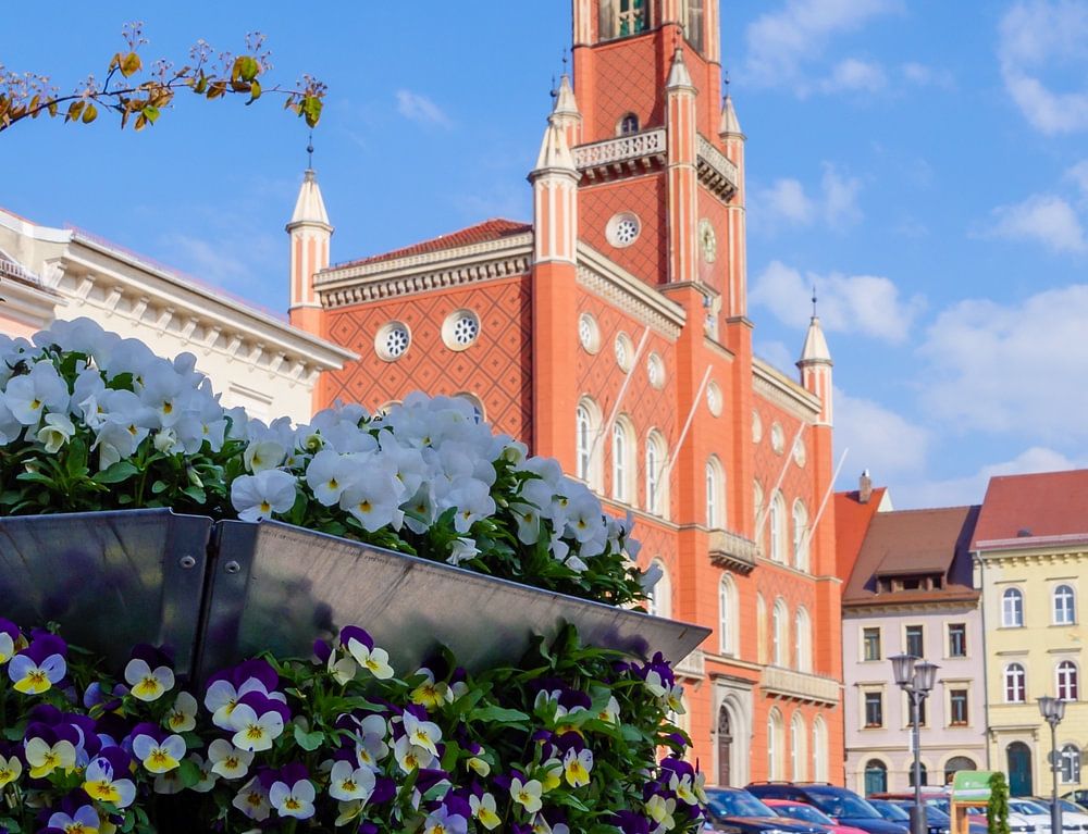 Blick auf den Marktplatz und Rathaus von Kamenz im Frühling