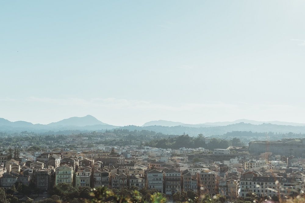 Skyline von Korfu-Stadt, fotografiert von der historischen Festung Old Fortress. Diese griechische Stadt ist in eine alte und eine neue Festung unterteilt.