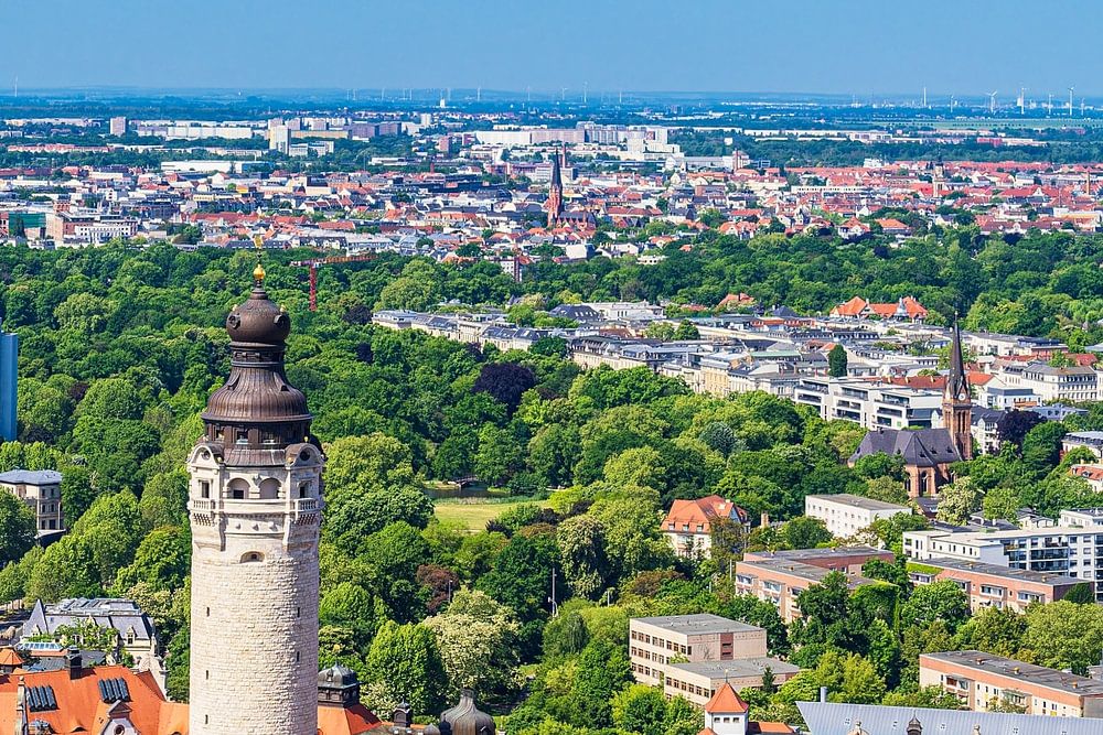 Blick über die Stadt Leipzig mit dem Neuen Rathaus.