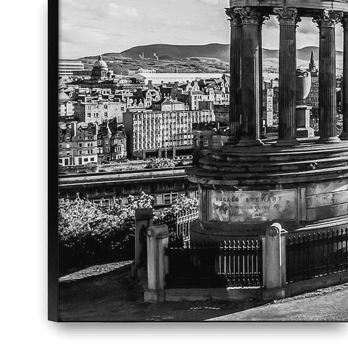 Schwarzweißfotografie Dugald Stewart Monument und der Blick von Calton Hill über die Innenstadt von Edinburgh, Schottland