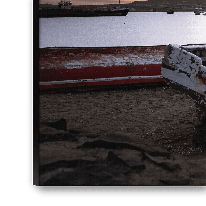 Blick von Mindelo auf Monte Cara, São Vicente, Kap Verde. Fischerboote am Strand und im Wasser, während die Sonne untergeht.