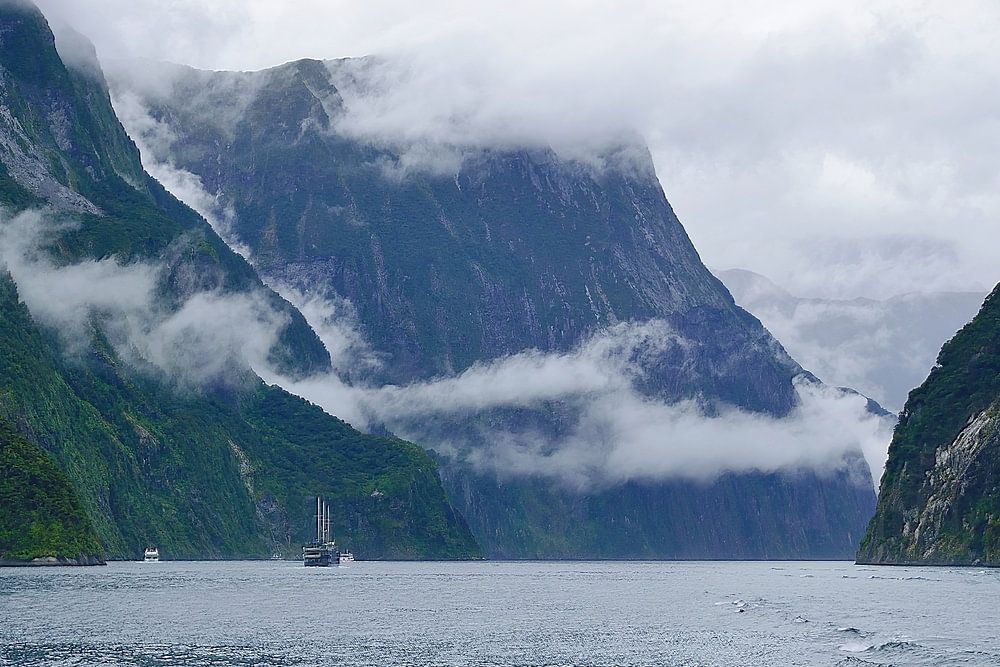 Blick zurück in den Milford Sound, Neuseeland, nachdem wir etwa eine Stunde lang gefahren sind. Die Wolken und gelegentlicher Regen sorgten für einen dramatischen Anblick.