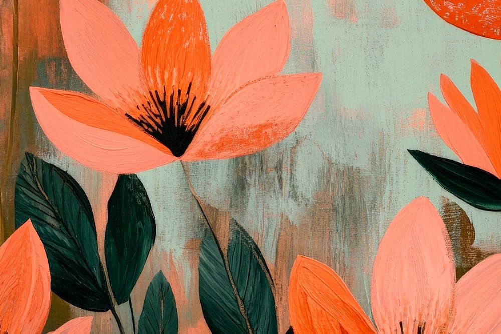 Farbenfrohe Blüten entfalten sich in einem harmonischen Zusammenspiel aus sanften Pfirsich- und leuchtenden Grüntönen. Diese lebendige Komposition bringt Frische und Lebensfreude in jeden Raum. Besonders gut eignet sich dieses Kunstwerk für das Wohnzimmer, wo es als Blickfang fungieren und eine einladende Atmosphäre schaffen kann.