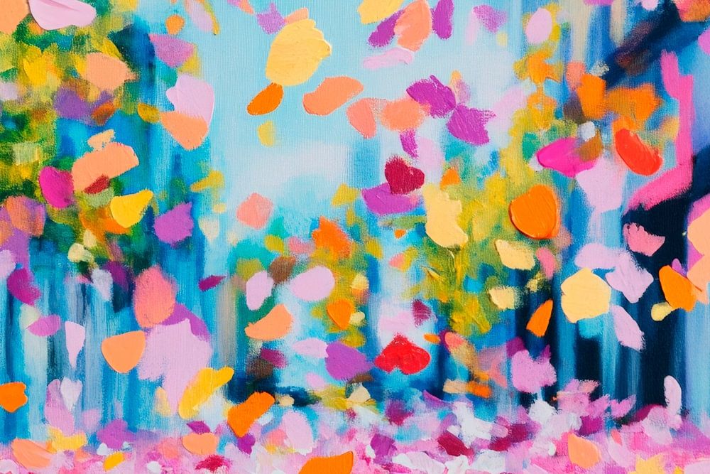 Farbenfrohe Blütenblätter tanzen im Licht und verleihen der Straßenszenerie eine lebendige Leichtigkeit. Die fröhliche Palette aus Rosa, Gelb und Blau erzeugt eine einladende Atmosphäre, die den Betrachter mit einem Gefühl von Frühling und Freude umhüllt. Perfekt für das Wohnzimmer, bringt dieses Kunstwerk einen Hauch von Frische und Inspiration in jeden Raum.