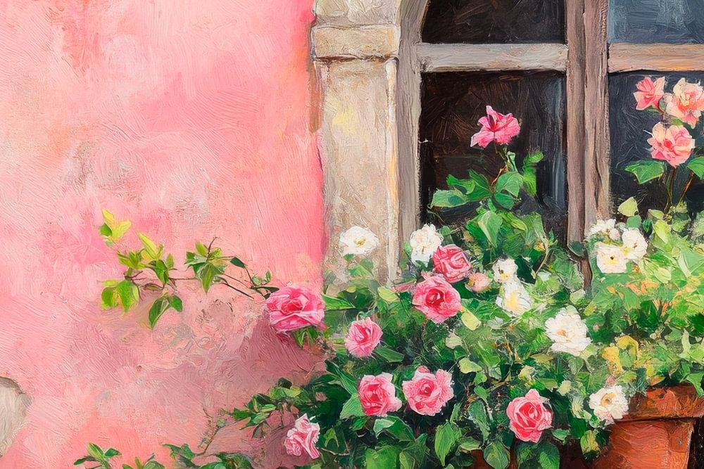 In sanften Pastelltönen strahlt die fensterumrahmte Blütepracht Lebensfreude aus. Die üppig blühenden Rosen und die grünen Ranken verleihen dem rustikalen Charme der alten Wand eine verspielte Anmut. Die sanft verwitterte Mauer erzählt von vergangenen Zeiten, während das Fenster einen geheimnisvollen Blick ins Innere gewährt. Ein harmonisches Zusammenspiel von Farbe und Natur.
