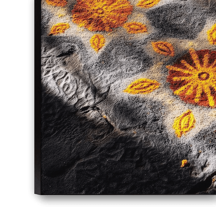 Lebendige Blumenmuster tanzen auf dem steinernen Boden, eingefangen im sanften Spiel von Licht und Schatten. Die warmen Gelbtöne strahlen eine einladende Energie aus, die jeden Raum erhellt. Ideal für die Küche, wo Kreativität und Genuss zuhause sind, bringt dieses Bild gleich Freude und Leben in den Alltag.