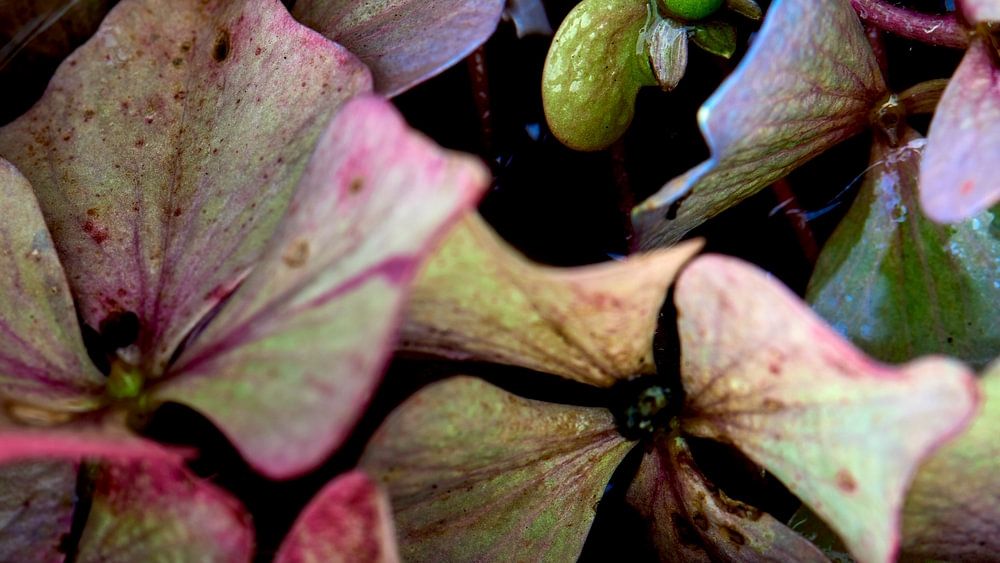 Blütenblätter von Hortensien, die ihre Blütezeit beendet haben, aber einen schönen Farbton haben, der zu einem kräftigen herbstlichen Pastell tendiert. Die Blumen liegen in einer Schale mit Wasser. Die Reflexion des Wassers ist in den Schatten besonders gut zu erkennen.