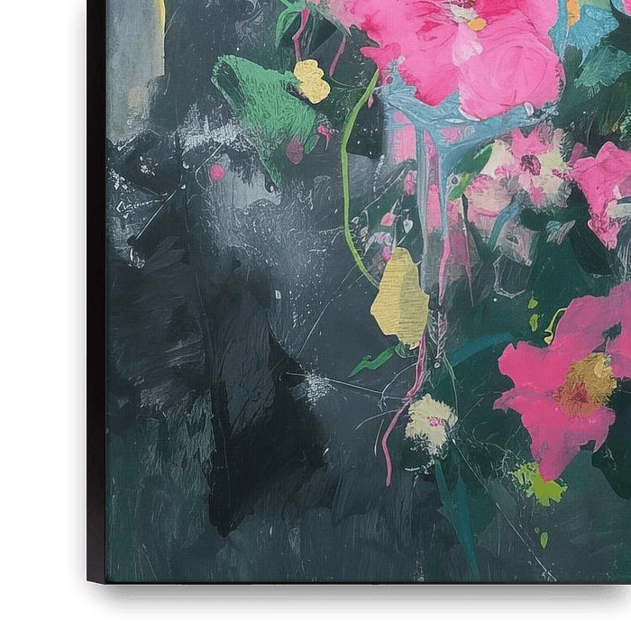 Details: Blumen, abstrakt, bunt, modern, Leinwand, Kunst, Gemälde, rosa, grün, gelb