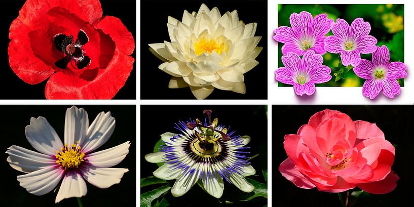 Dieses Foto habe ich aus 6 verschiedenen Blumen zusammengestellt. Alle sind Nahaufnahmen, damit die Details gut zu erkennen sind. Von links oben nach rechts unten: Eine rote Mohnblume (Papaver) mit 4 schwarzen Flecken im Inneren. Mit einem weißen Rand an der Außenseite dieser Flecken. Meiner Meinung nach soll das dem Hinterteil einer…