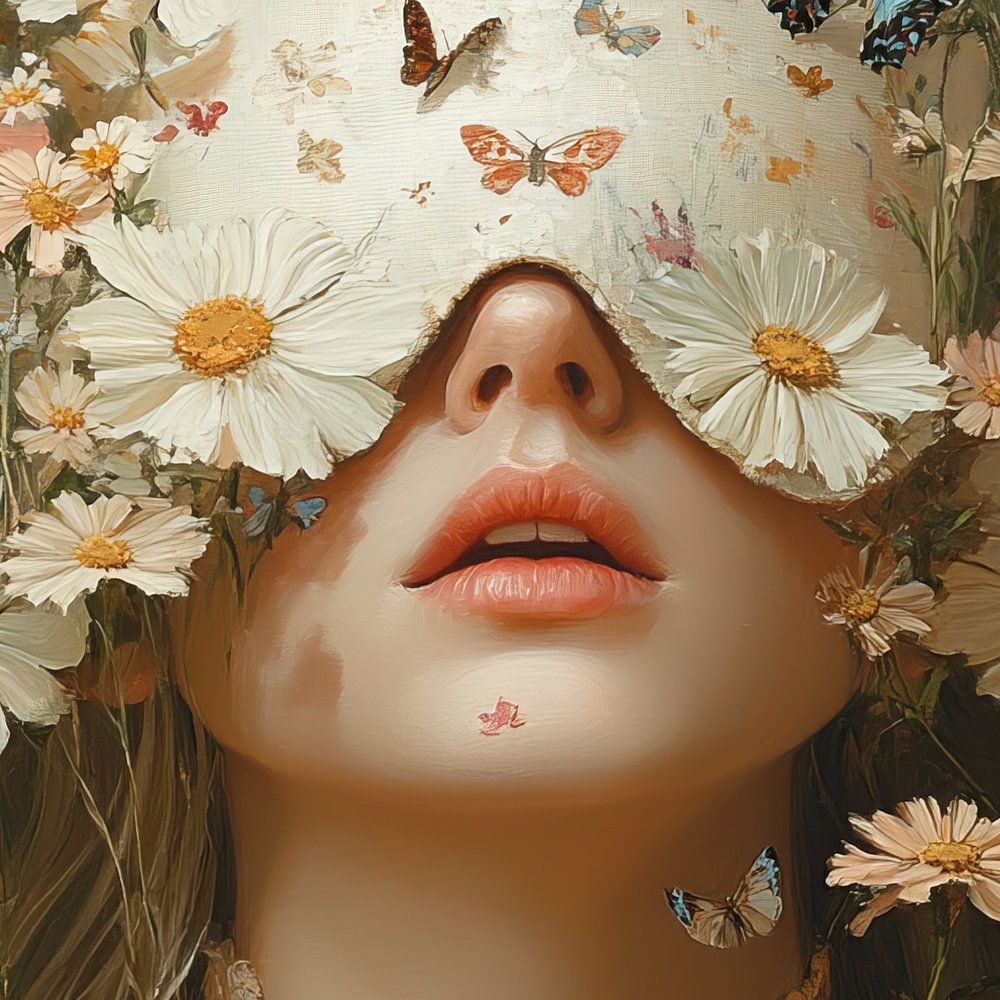 Blumen Schmetterlinge | Weiße Blumen Frau Porträt - Dieses Blumengemälde zeigt das Porträt einer Frau, deren Gesicht mit einer üppigen Vielfalt an weißen und rosafarbenen Blumen bedeckt ist, umgeben von anmutigen Schmetterlingen in verschiedenen Farben.