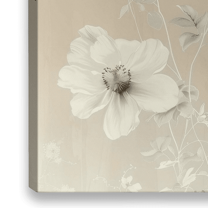 Blumen im japanischen Stil im neuen Landhausstil. Weiße Blumen auf einem taupefarbenen Hintergrund. Wählen Sie Ihre eigene Größe und Material für diese Arbeit und machen Sie es zu einem echten Blickfang für Ihr Interieur.