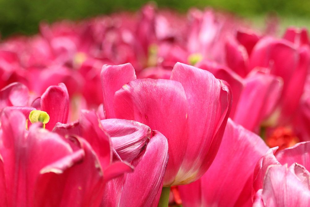Im Keukenhof blühen bunte Blumen. Die Bilder sind aus der Nähe betrachtet, so dass die Blumen im Bild hervorstechen.