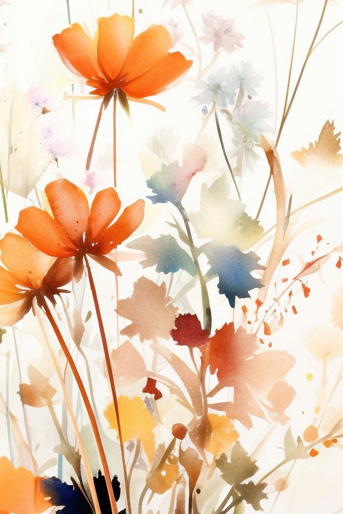 Field of Flowers - Das Werk zeigt einen zarten Blumenstrauß und Blätter in Pastellfarben und warmen Pfirsichflaumtönen, subtil und frisch. Die Aquarellmalerei schafft eine luftige und natürliche Atmosphäre, und ein einzelner Schmetterling trägt zur Lebendigkeit der Szene bei.